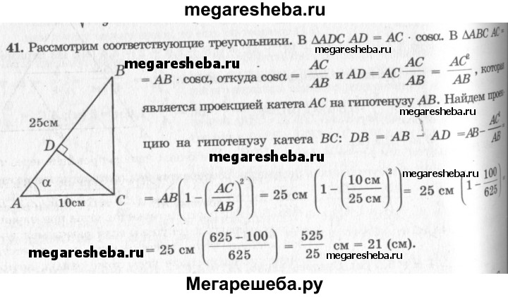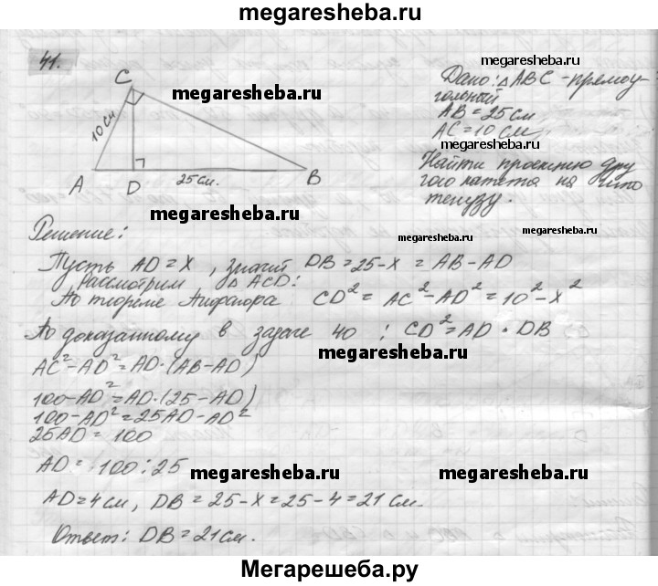41. Гипотенуза прямоугольного треугольника равна 25 см, а один из катетов равен 10 см. Найдите проекцию другого катета на гипотенузу.