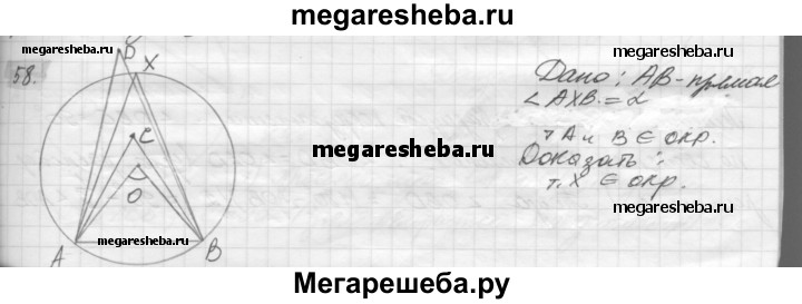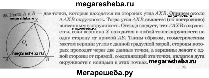 58. Докажите, что геометрическое место вершин углов с заданной градусной мерой, стороны которых проходят через две данные точки, а вершины лежат по одну сторону от прямой, соединяющей эти точки, есть дуга окружности с концами в этих точках (рис. 264, а).