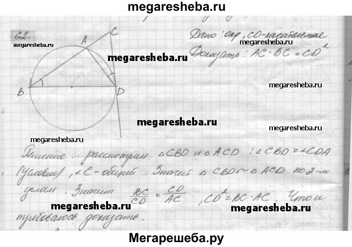 62. Докажите, что произведение отрезков секущей окружности равно квадрату отрезка касательной, проведённой из той же точки: АС • ВС = CD2 (рис. 264, в).