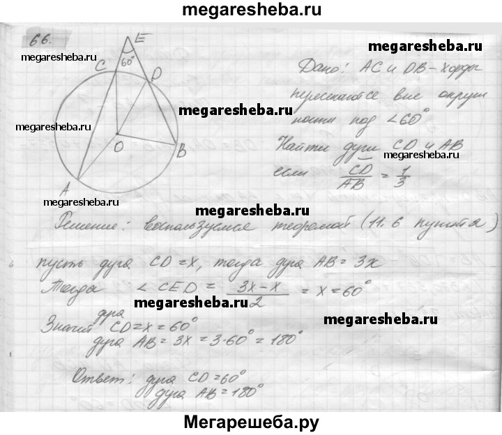 66. Продолжения хорд пересекаются вне окружности под углом 60°. Найдите градусные меры двух дуг, заключённых между сторонами этого угла, если они относятся как 1:3.