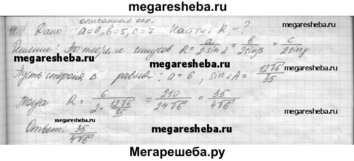 14. Как найти радиус окружности, описанной около треугольника, зная его стороны? Найдите радиус окружности, описанной около треугольника со сторонами 5 м, 6 м, 7 м.