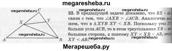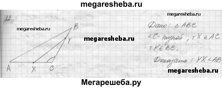 22 У треугольника ABC угол С тупой. Докажите, что если точка X лежит на стороне АС, а точка У — на стороне ВС, то ХУ < АВ.