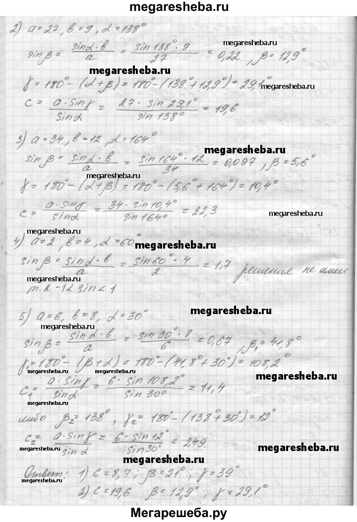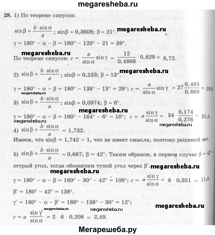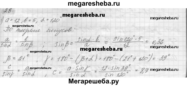 28 В треугольнике заданы две стороны и угол, противолежащий одной из сторон. Найдите остальные углы и третью сторону треугольника, если: 1) а = 12, b = 5, α = 120°; 2) а = 27, b = 9, α = 138°; 3) а = 34, b = 12, α = 164°; 4) а = 2, b = 4, α = 60°; 5) а = 6, b = 8, α = 30°.