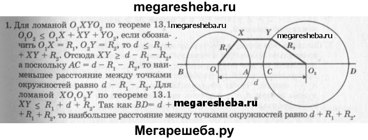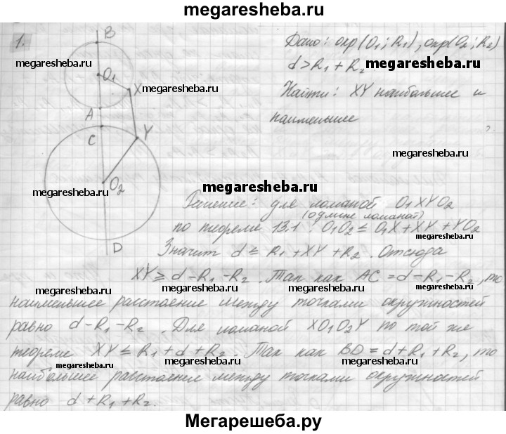 1 Даны две окружности с радиусами B1 и R2 и расстоянием между центрами d > R1 + R. Чему равны наибольшее и наименьшее расстояния между точками X и Y этих окружностей?