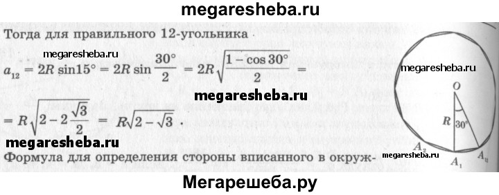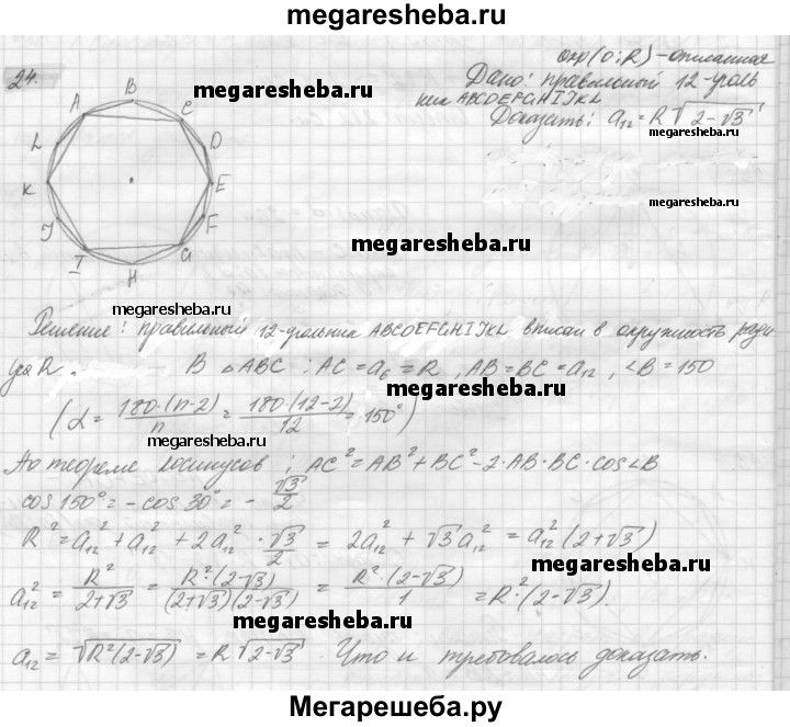 24. Докажите, что сторона правильного 12-угольника вычисляется по формуле a12 = R√(2-√3), где R — радиус описанной окружности.