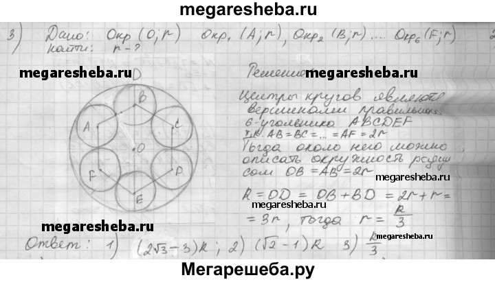 44. Внутри окружности радиуса R расположены га равных окружностей, которые касаются друг друга и данной окружности. Найдите радиусы этих окружностей, если число их равно: 1) 3; 2) 4; 3) 6 (рис. 295).