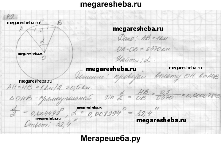 49. Какой угол образуют радиусы Земли, проведённые в две точки на её поверхности, расстояние между которыми равно 1 км? Радиус Земли 6370 км.