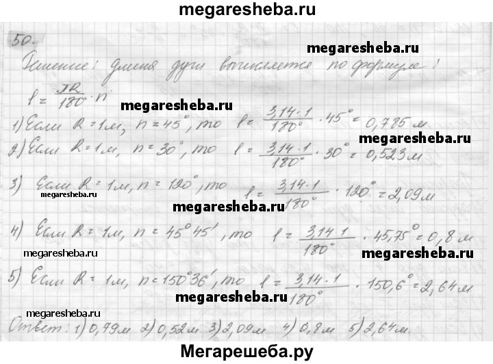 50. По радиусу R = 1 м найдите длину дуги, отвечающей центральному углу: 1) 45°; 2) 30°; 3) 120°; 4) 45°45'; 5) 150°36'.