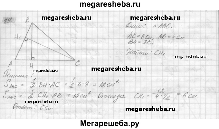 19. У треугольника со сторонами 8 см и 4 см проведены высоты к этим сторонам. Высота, проведённая к стороне 8 см, равна 3 см. Чему равна высота, проведённая к стороне 4 см?