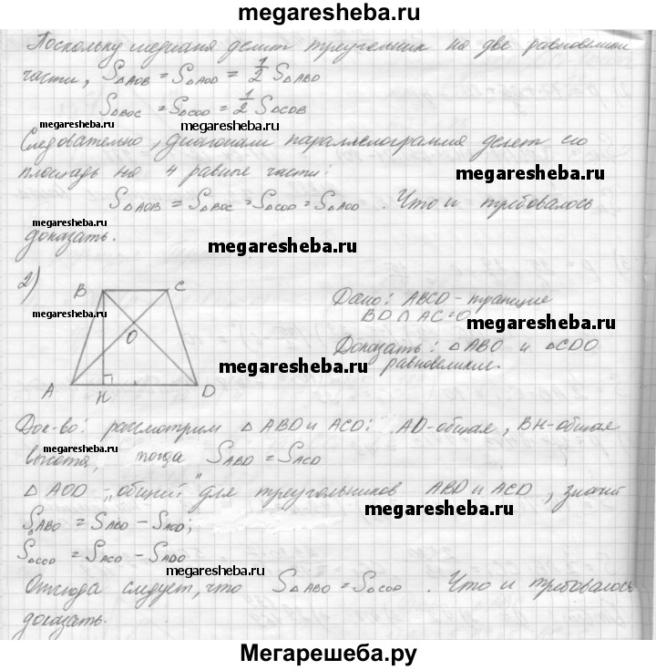 36. 1) Докажите, что диагонали параллелограмма разбивают его на четыре равновеликих треугольника. 2) Диагонали трапеции ABCD с основаниями ВС и AD пересекаются в точке О. Докажите, что треугольники АВО и CDO равновеликие.