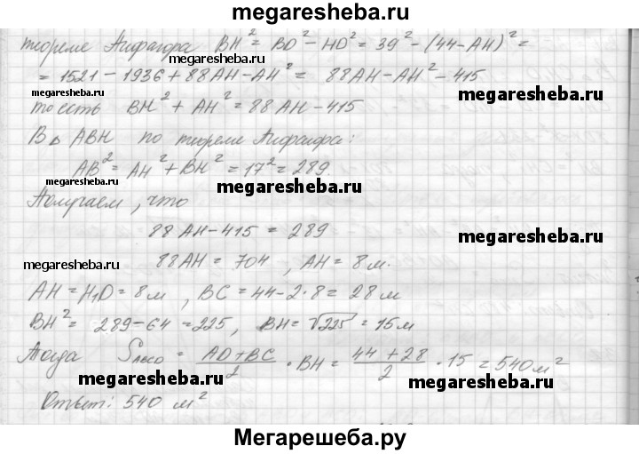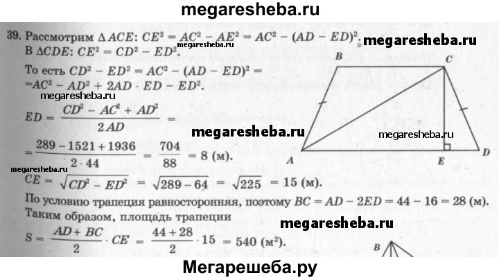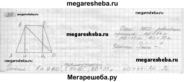 39. В равнобокой трапеции большее основание равно 44 м, боковая сторона 17 м и диагональ 39 м. Найдите площадь трапеции.