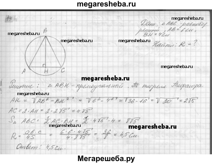 44. Боковая сторона равнобедренного треугольника 6 см, высота, проведённая к основанию, 4 см. Найдите радиус описанной окружности.