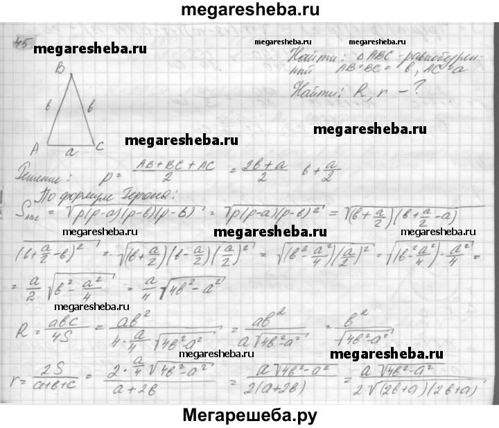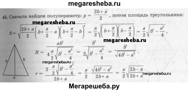45. Найдите радиусы окружностей, описанной около равнобедренного треугольника с основанием а и боковой стороной b и вписанной в него.