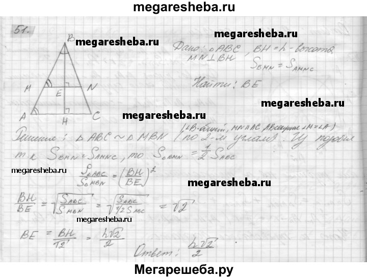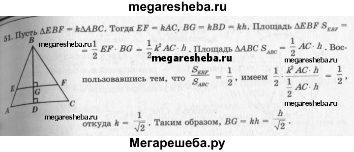 51. Прямая, перпендикулярная высоте треугольника, делит его площадь пополам. Найдите расстояние от этой прямой до вершины треугольника, из которой проведена высота, если она равна h.