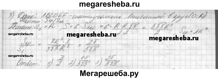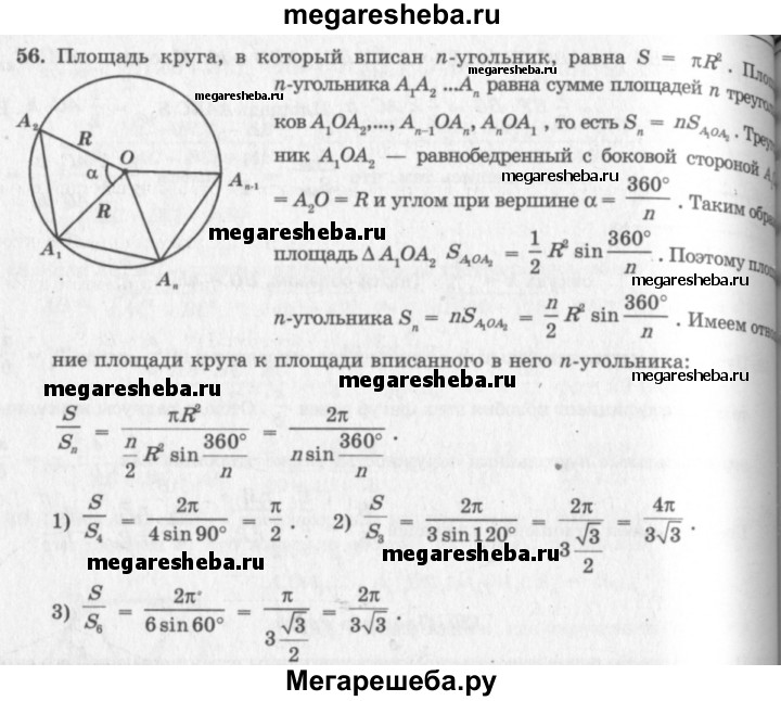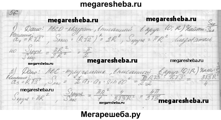 56. Найдите отношение площади круга к площади вписанного в него: 1) квадрата; 2) правильного треугольника; 3) правильного шестиугольника.