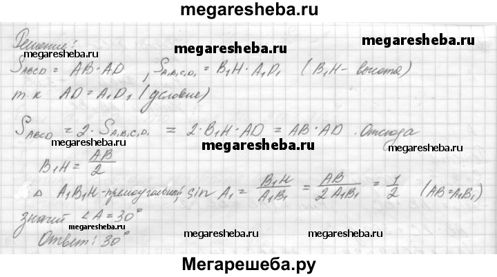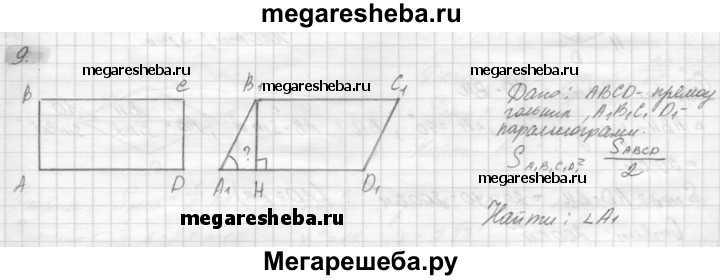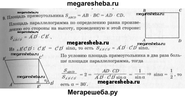 9. Параллелограмм и прямоугольник имеют одинаковые стороны. Найдите острый угол параллелограмма, если площадь его равна половине площади прямоугольника.