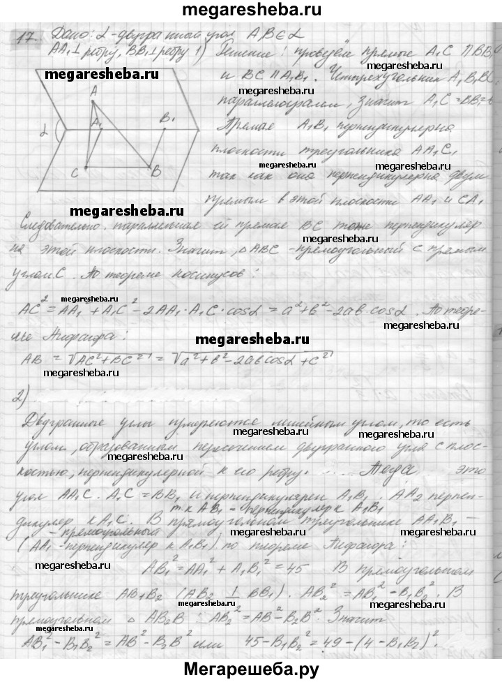 17. Из точек А и В, лежащих в гранях двугранного угла, опущены перпендикуляры АА1 и ВВ1 на ребро угла. Найдите: 1) отрезок АВ, если АА1 = а, ВВ1 = b, А1В1 = с и двугранный угол равен а; 2) двугранный угол а, если АА1 = 3, ВВ1 = 4, А1В1 = 6, АВ = 7.