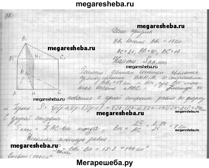 18. В прямой треугольной призме стороны основания равны 10 см, 17 см и 21 см, а высота призмы 18 см. Найдите площадь сечения, проведённого через боковое ребро и меньшую высоту основания.