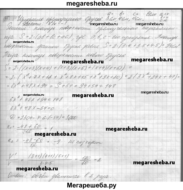 35 Измерения прямоугольного бруска 3 см, 4 см, 5 см. Если увеличить каждое ребро на х сантиметров, то поверхность увеличится на 54 см2. Как увеличится объём?