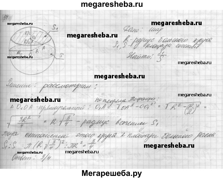 54 Через середину радиуса шара проведена перпендикулярная ему плоскость. Как относится площадь полученного сечения к площади большого круга? (Большим кругом называется сечение шара плоскостью, проходящей через его центр.)