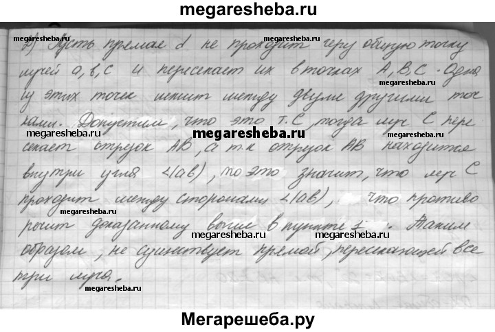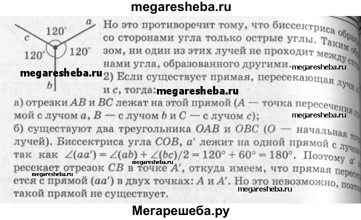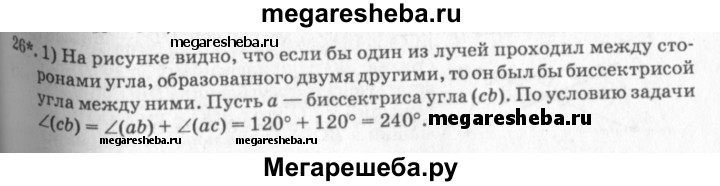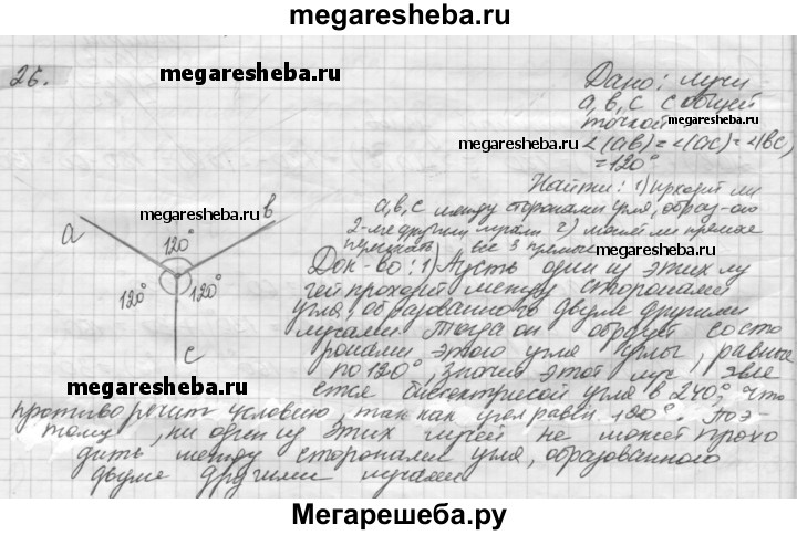 26. Даны три луча a, b, с с общей начальной точкой. Известно, что A(ab) = А(ас) = А(bс) = 120°. 1) Проходит ли какой-нибудь из этих лучей между сторонами угла, образованного двумя другими лучами? 2) Может ли прямая пересекать все три данных луча? Объясните ответ.