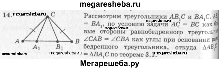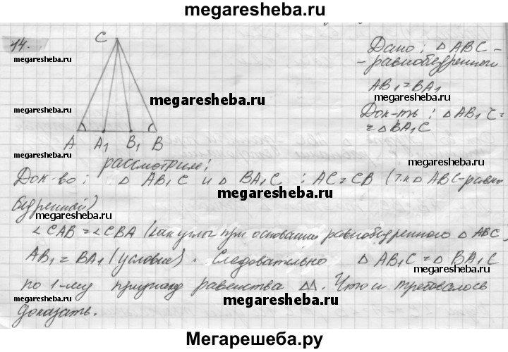 14. На основании АВ равнобедренного треугольника ABC даны точки А1 и В1. Известно, что АВ1 = ВА1. Докажите, что треугольники АВ1С и ВА1С равны.