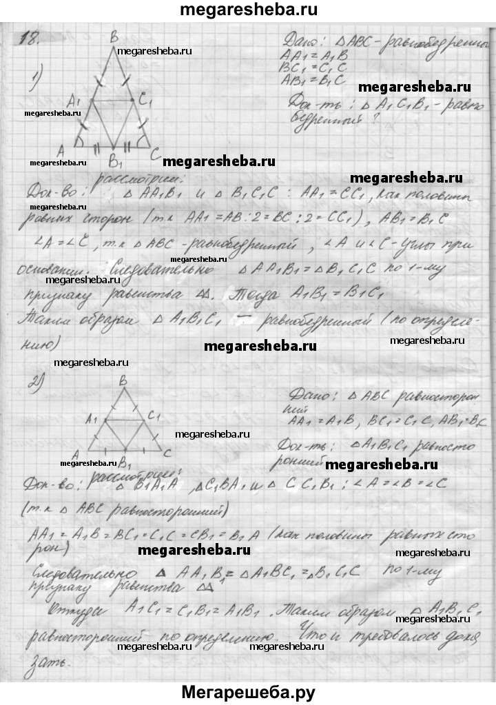 18. 1) Докажите, что середины сторон равнобедренного треугольника являются также вершинами равнобедренного треугольника. 2) Докажите, что середины сторон равностороннего треугольника являются также вершинами равностороннего треугольника.