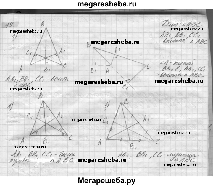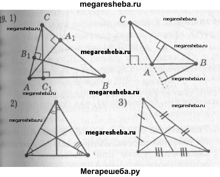 19. 1) Начертите треугольник с острыми углами. С помощью чертёжного угольника и линейки проведите в нём высоты. Повторите упражнение для треугольника, у которого один угол тупой. 2) Начертите треугольник. С помощью транспортира и линейки проведите в нём биссектрисы. 3) Начертите треугольник. С помощью линейки с делениями проведите в нём медианы.