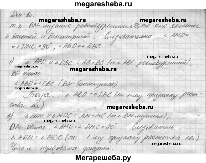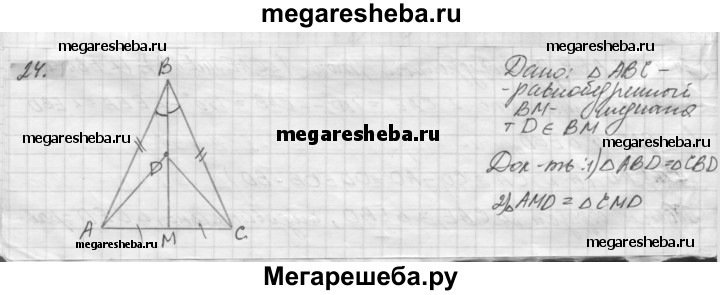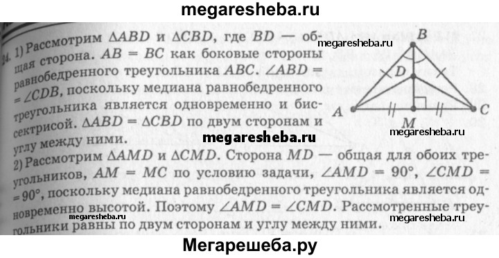 24. В равнобедренном треугольнике ABC с основанием АС проведена медиана ВМ. На ней взята точка D. Докажите равенство треугольников: 1) ABD и CBD; 2) AMD и CMD.