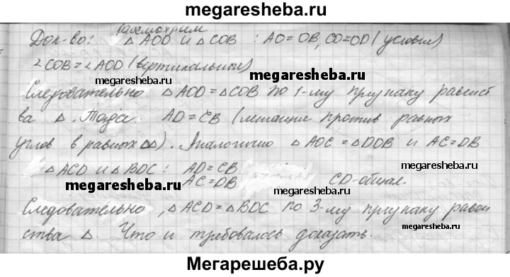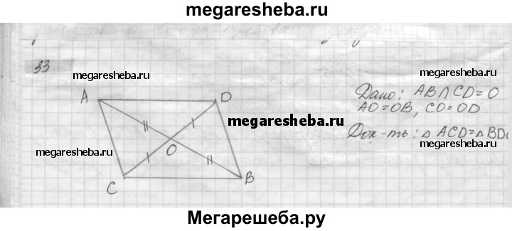 33. Два отрезка АВ и CD пересекаются в точке О, которая является серединой каждого из них. Докажите равенство треугольников ACD и В DC.
