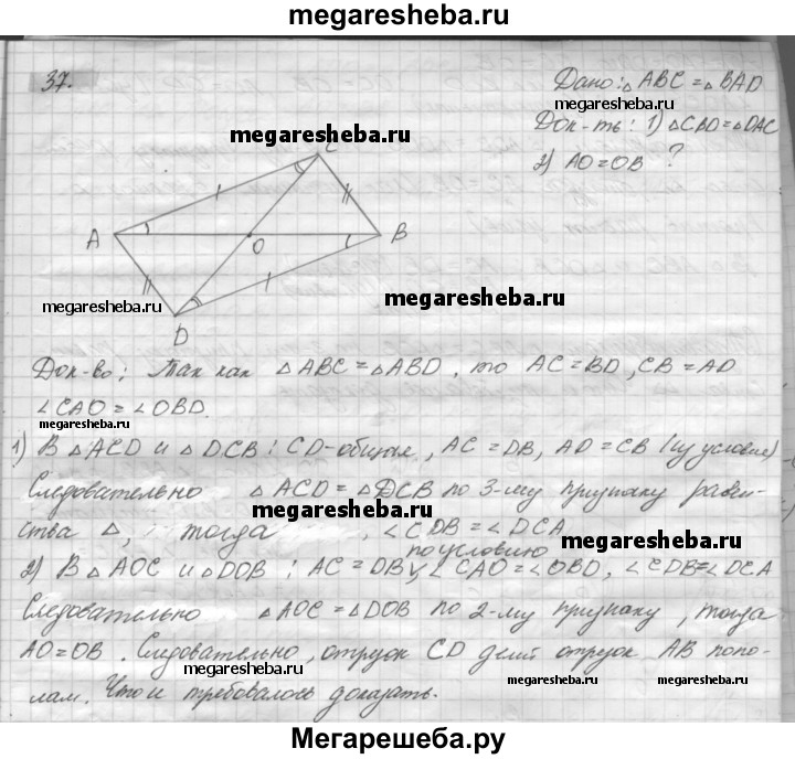37. Треугольники ABC и BAD равны, причём точки С и D лежат по разные стороны от прямой АВ (рис. 67). Докажите, что: 1) треугольники CBD и DAC равны; 2) прямая CD делит отрезок АВ пополам.
