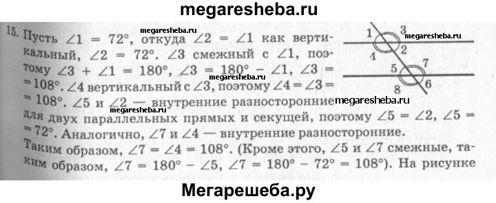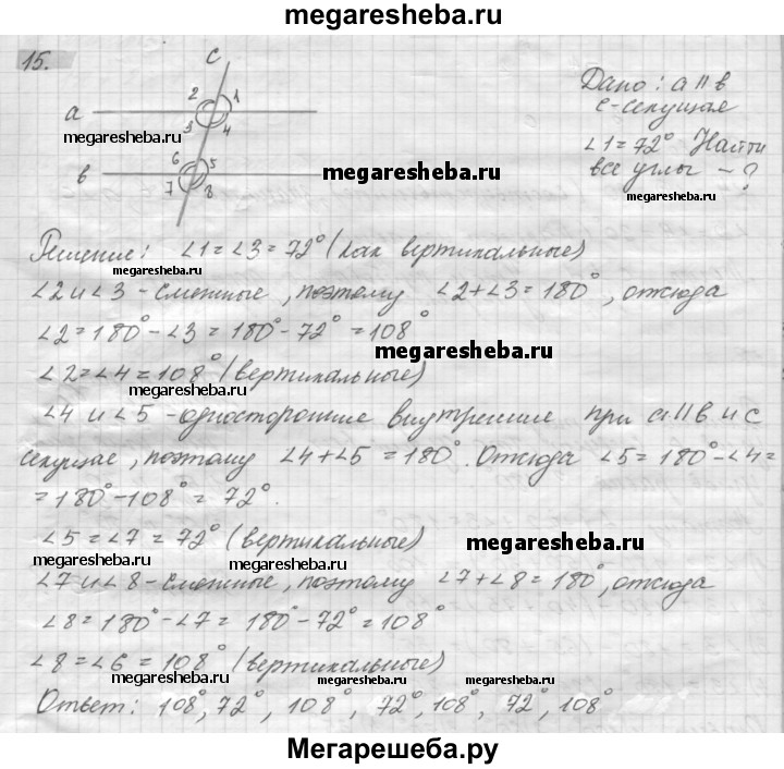 15. Один из углов, которые получаются при пересечении двух параллельных прямых секущей, равен 72°. Найдите остальные семь углов.