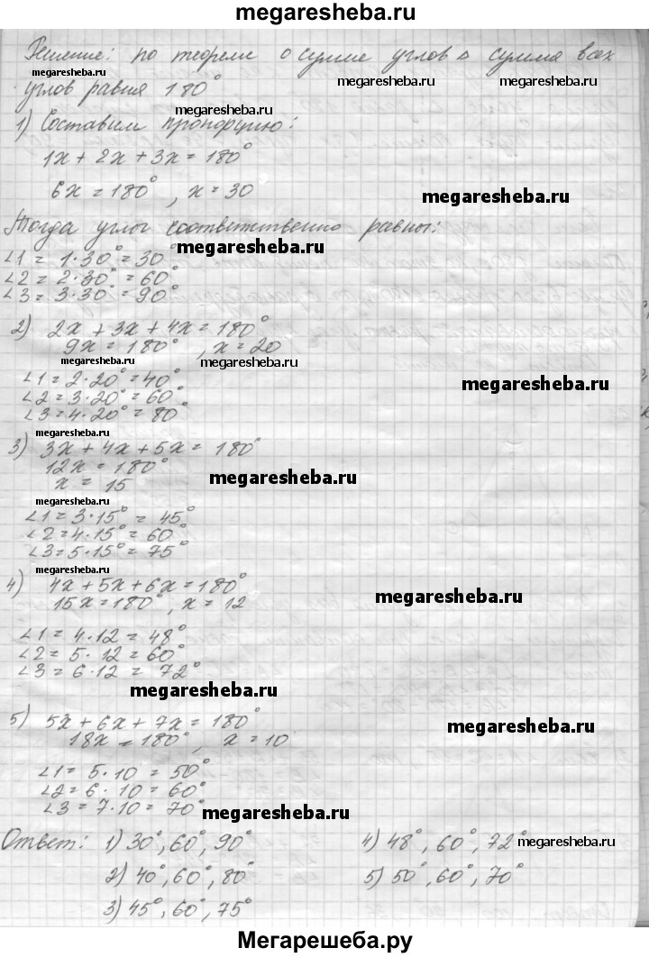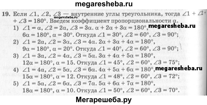 19. Найдите углы треугольника, если они пропорциональны числам: 1) 1, 2, 3; 2) 2, 3, 4; 3) 3, 4, 5; 4) 4, 5, 6; 5) 5, 6, 7.