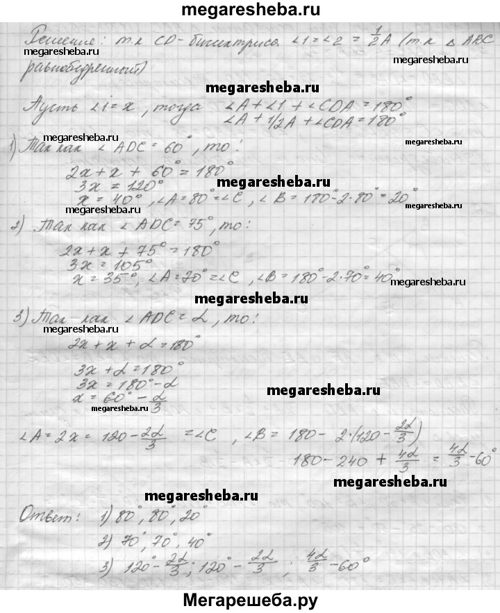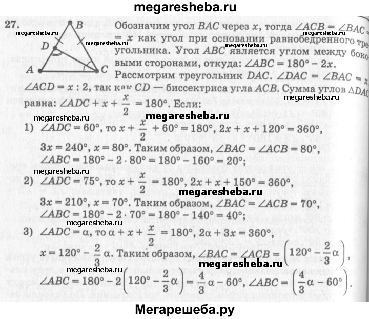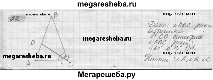27. В равнобедренном треугольнике ABC с основанием АС проведена биссектриса CD. Найдите углы треугольника ABC, если угол ADC равен: 1) 60°; 2) 75°; 3)α.