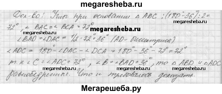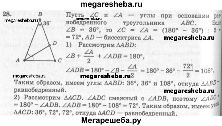 28. В равнобедренном треугольнике ABC с основанием АС и углом при вершине В, равным 36°, проведена биссектриса AD. Докажите, что треугольники CDA и ADB равнобедренные (рис. 88).
