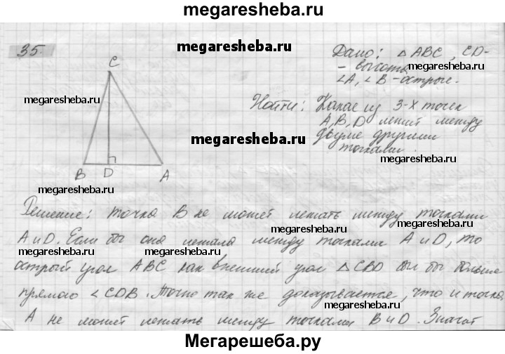 35. В треугольнике ABC проведена высота CD. Какая из трёх точек А, В, D лежит между двумя другими, если углы А и В треугольника острые?