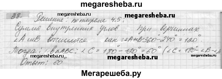 38. Сумма внешних углов треугольника ABC при вершинах А и В, взятых по одному для каждой вершины, равна 240°. Чему равен угол С треугольника?