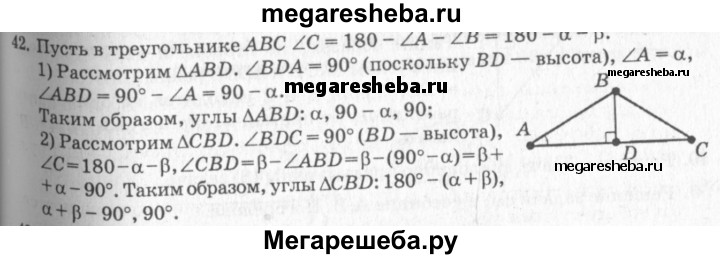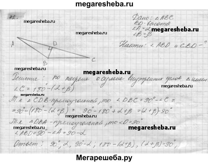 42. Из вершины тупого угла В треугольника ABC проведена высота BD. Найдите углы треугольников ABD и CBD, зная, что ∠А = α, ∠B = β.