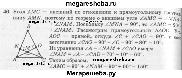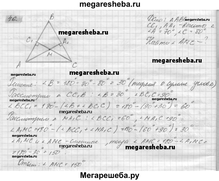 46. Высоты треугольника ABC, проведённые из вершин А и С, пересекаются в точке М. Найдите ∠АМС, если ∠A = 70°, ∠С = 80°.