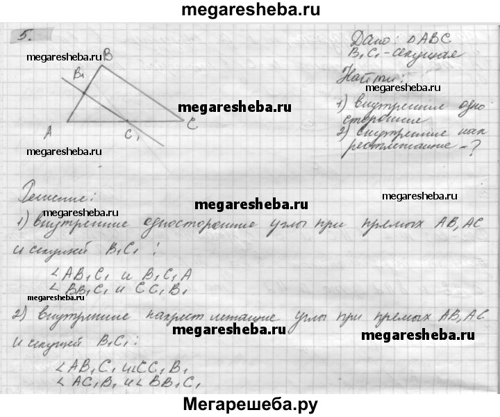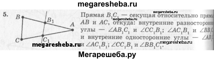 5. Дан треугольник ABC. На стороне АВ отмечена точка В1, а на стороне АС — точка С1. Назовите внутренние односторонние и внутренние накрест лежащие углы при прямых АВ, АС и секущей В1С1.
