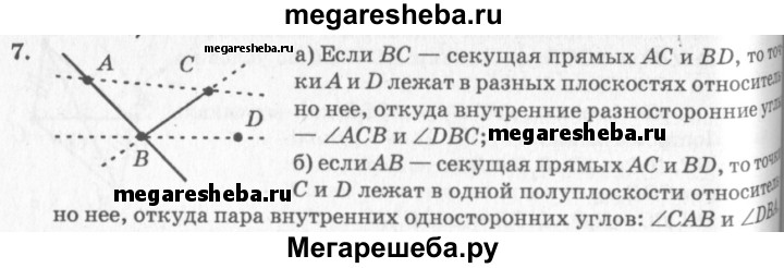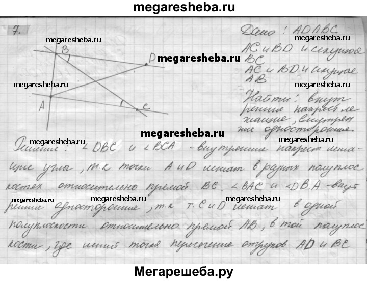 7. Отрезки AD и ВС пересекаются. Для прямых АС и BD и секущей ВС назовите пару внутренних накрест лежащих углов. Для тех же прямых и секущей АВ назовите пару внутренних односторонних углов. Объясните ответ.