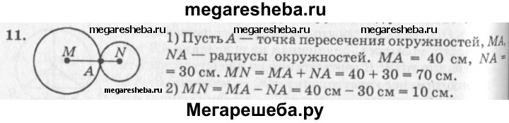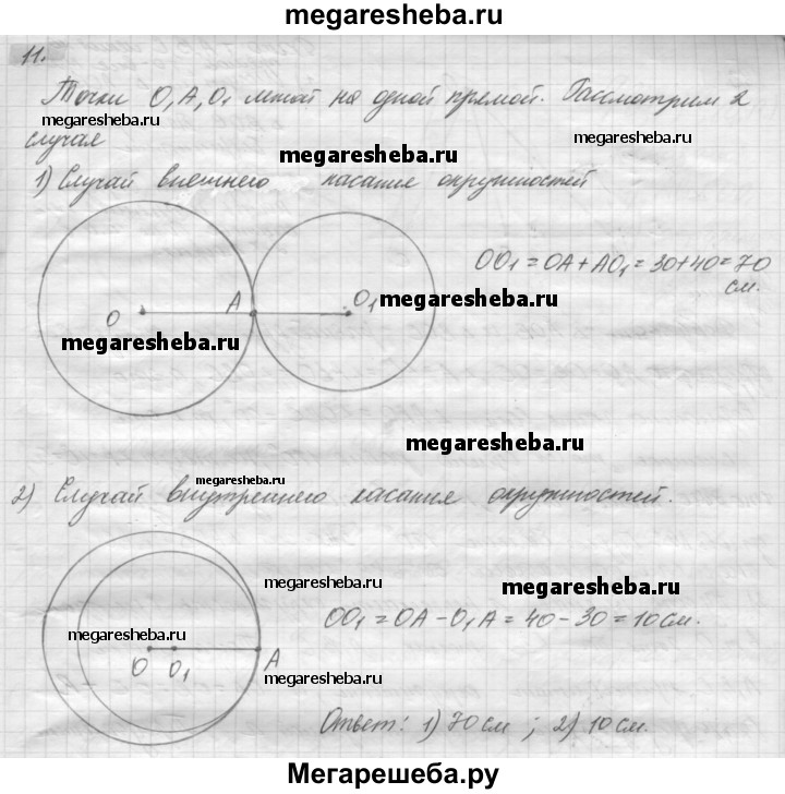 11. Окружности с радиусами 30 см и 40 см касаются. Найдите расстояние между центрами окружностей в случаях внешнего и внутреннего касаний.