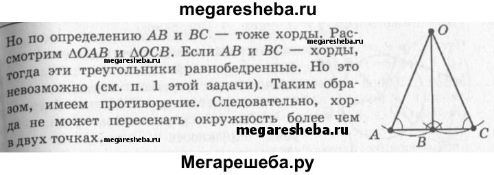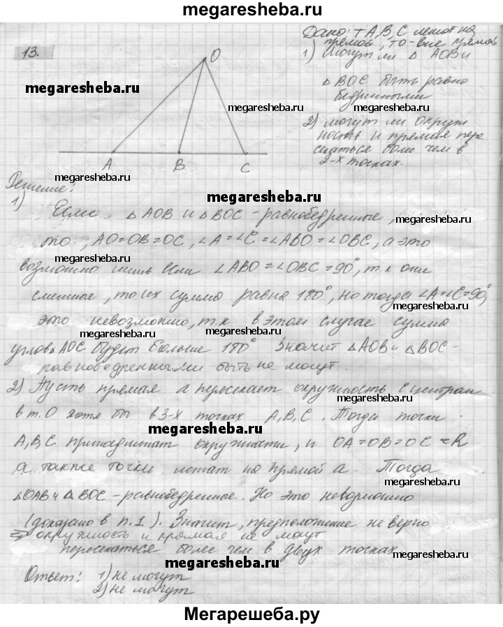 13. 1) Точки А, В, С лежат на прямой, а точка О — вне прямой. Могут ли два треугольника АОВ и ВОС быть равнобедренными с основаниями АВ и ВС? Обоснуйте ответ. 2) Могут ли окружность и прямая пересекаться более чем в двух точках?