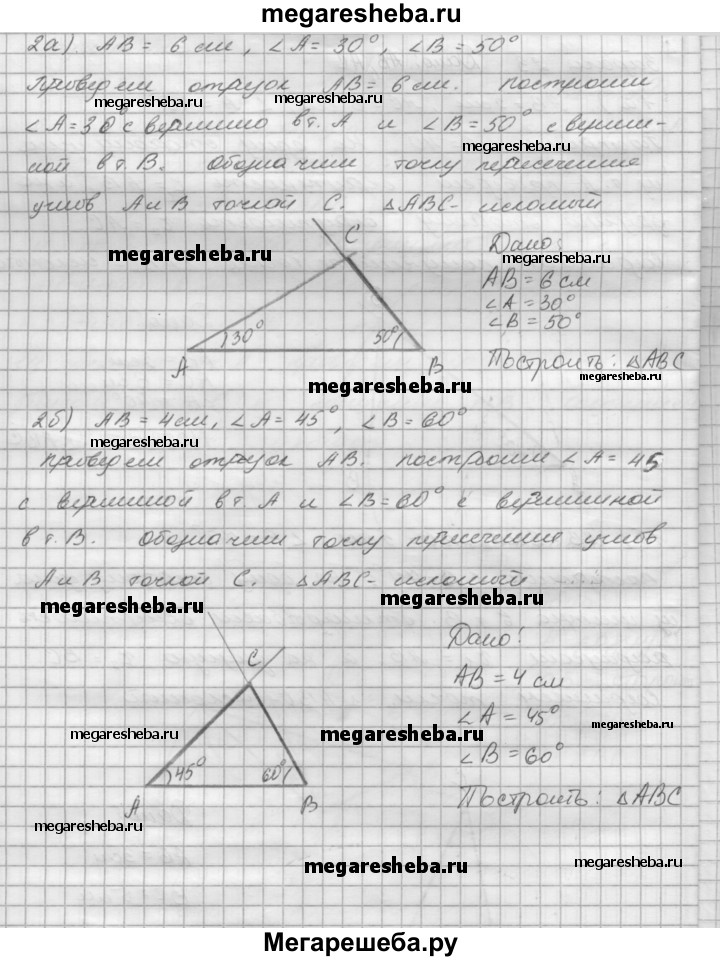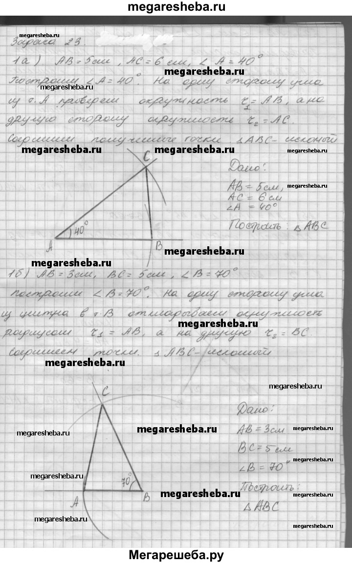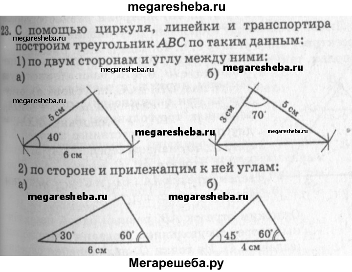 23. Постройте треугольник ABC по следующим данным: 1) по двум сторонам и углу между ними: а) АВ = 5 см, АС = 6 см, ∠A = 40°; б) АВ = 3 см, ВС = 5 см, ∠B = 70°; 2) по стороне и прилежащим к ней углам: а) АВ = 6 см, ∠A = 30°, ∠B = 50°; б) АВ = 4 см, ∠A = 45°, ∠В = 60°.