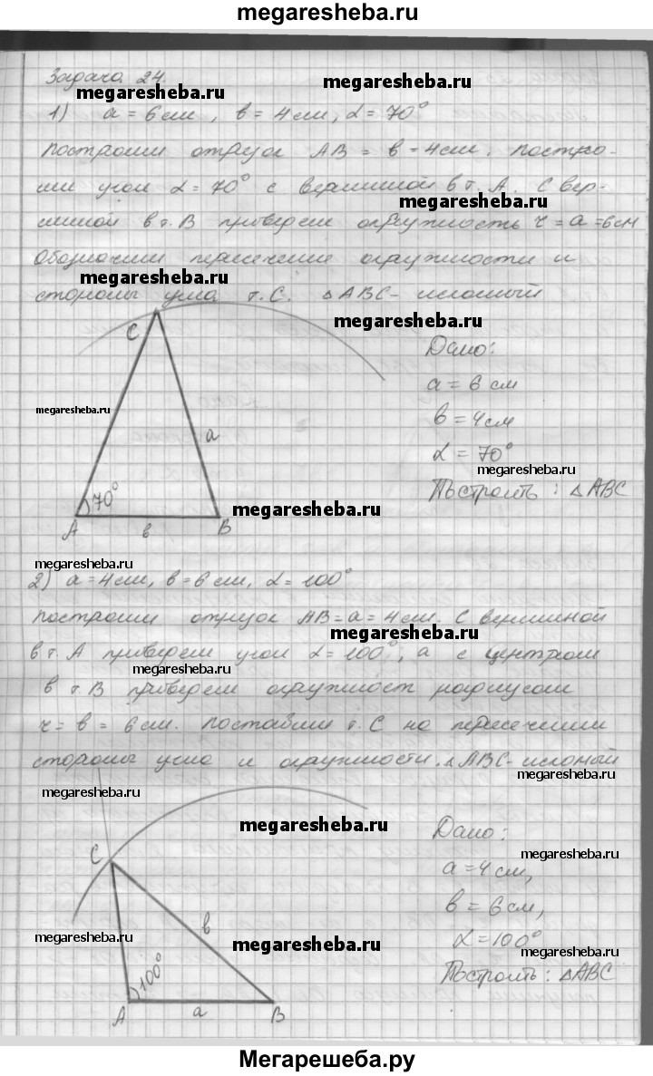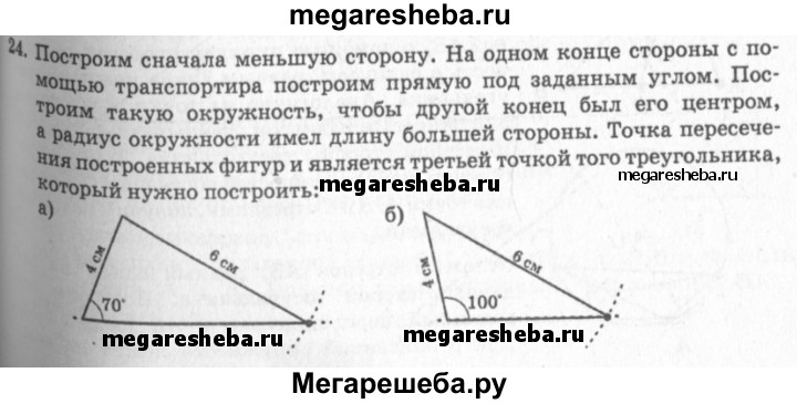 24. Постройте треугольник по двум сторонам и углу, противолежащему большей из них: 1) а = 6 см, b = 4 см, α = 70°; 2) а = 4 см, b = 6 см, β = 100°.