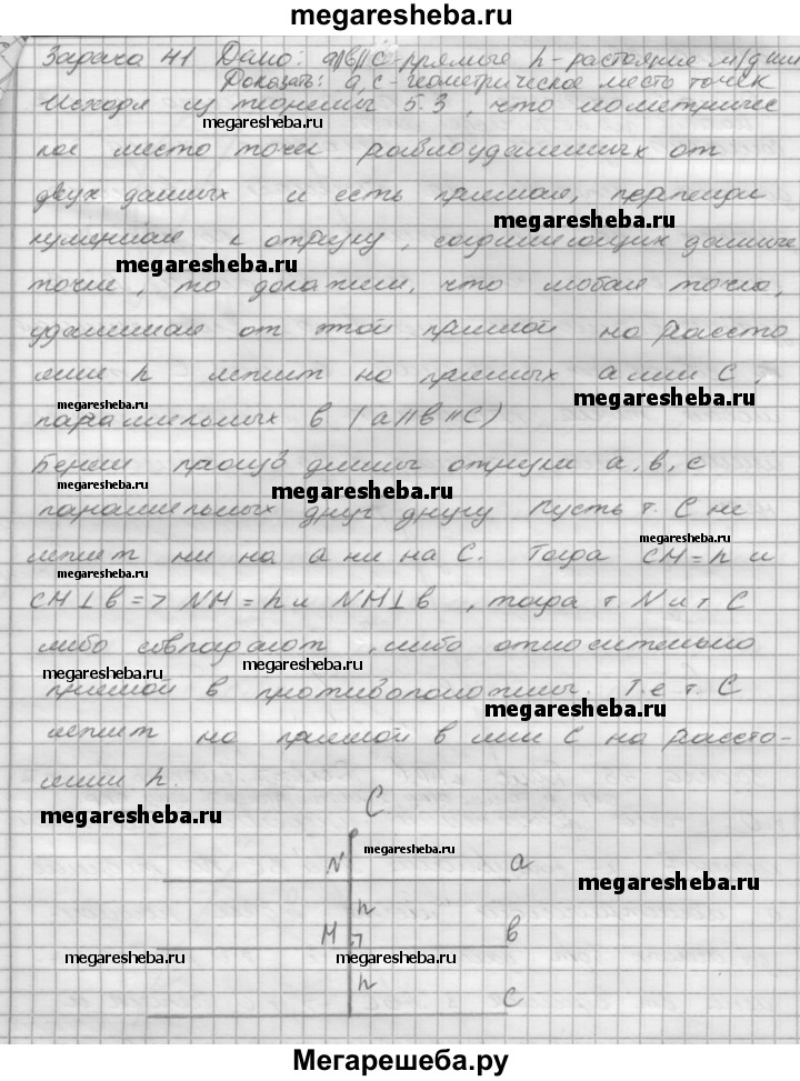 41. Докажите, что геометрическое место точек, удалённых от данной прямой на расстояние h, состоит из двух прямых, параллельных данной и отстоящих от неё на расстояние h.