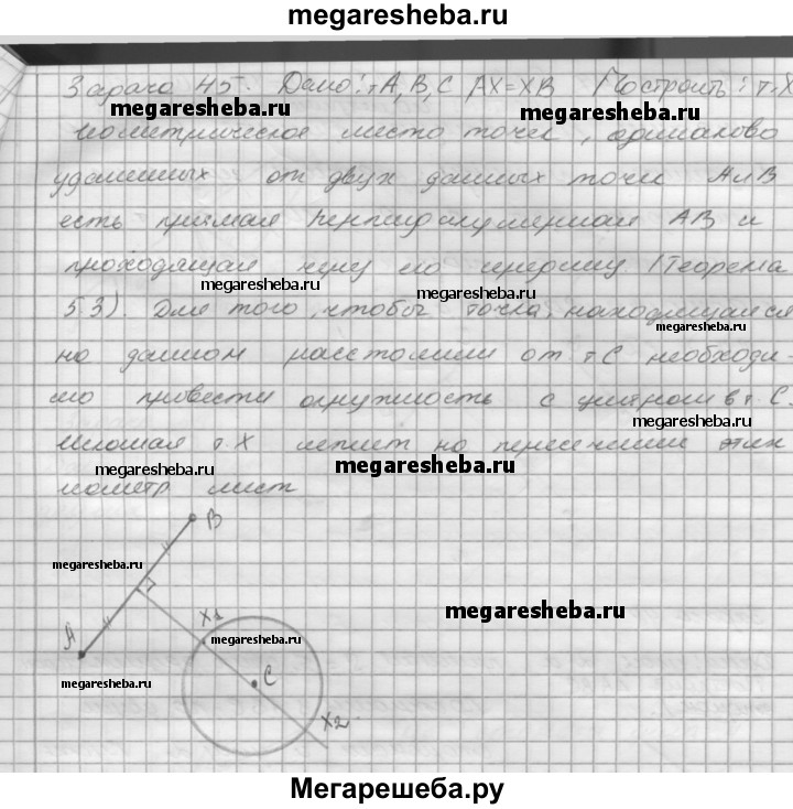 45. Даны три точки: А, В, С. Постройте точку X, которая одинаково удалена от точек А и В и находится на данном расстоянии от точки С.