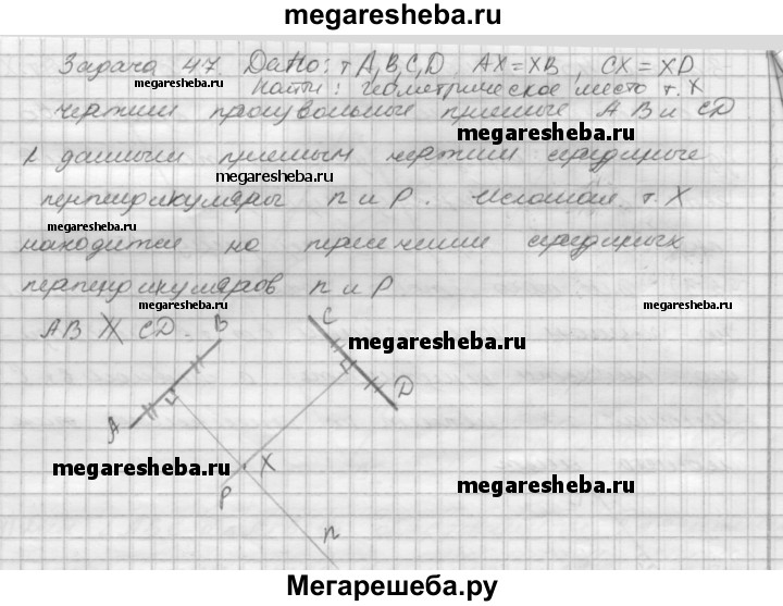 47. Даны четыре точки: А, В, С, D. Найдите точку X, которая одинаково удалена от точек А и В и одинаково удалена от точек С и D.