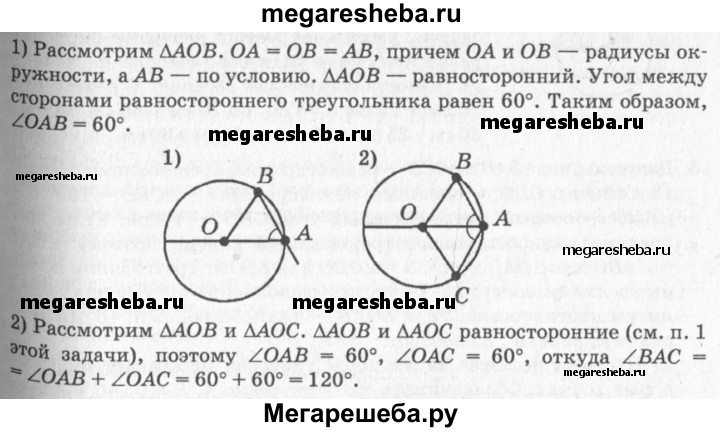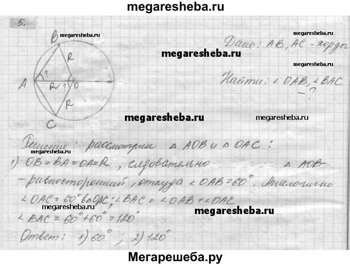 5. 1) Из точки данной окружности проведены диаметр и хорда, равная радиусу. Найдите угол между ними (рис. 107). 2) Из точки данной окружности проведены две хорды, равные радиусу. Найдите угол между ними.