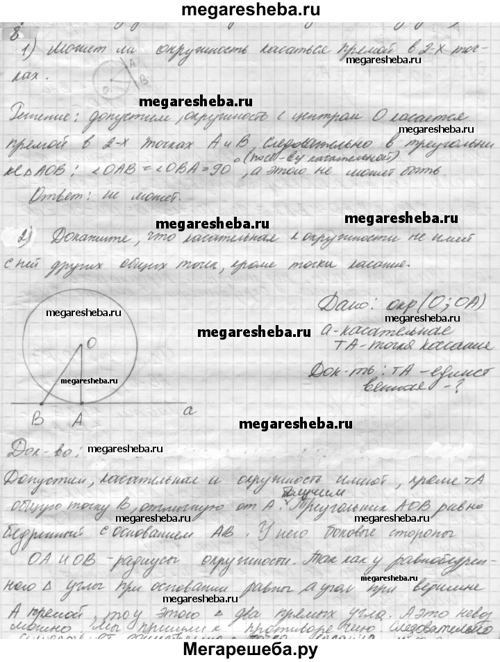 8.1) Может ли окружность касаться прямой в двух точках? Объясните ответ. 2) Докажите, что касательная к окружности не имеет с ней других общих точек, кроме точки касания.